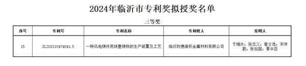 近日,臨沂市市場(chǎng)監(jiān)督管理局發(fā)布《2024年度臨沂市專利獎(jiǎng)擬授獎(jiǎng)項(xiàng)目公示》信息,臨沂玫德庚辰金屬材料有限公司的專利項(xiàng)目“一種風(fēng)電鑄件用球墨鑄鐵的生產(chǎn)裝置及工藝”榮獲臨沂市專利獎(jiǎng)三等獎(jiǎng)。這一榮譽(yù)不僅是對(duì)玫德庚辰在技術(shù)創(chuàng)新領(lǐng)域上的肯定,也是對(duì)公司研發(fā)實(shí)力和創(chuàng)新能力的高度認(rèn)可。