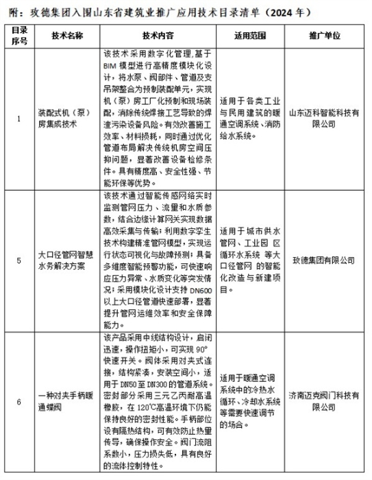 近日,山東省住房和城鄉(xiāng)建設廳發(fā)布了《山東省建筑業(yè)推廣應用技術目錄(2024年度)》, 玫德集團旗下玫德集團有限公司、濟南邁克閥門科技有限公司、山東邁科智能科技有限公司各有1項成果入選;其中《大口徑管網(wǎng)智慧水務解決方案》成為山東省住建廳重點選取的有引領性、示范性和產(chǎn)業(yè)帶動作用的標志性成果之一。此次征集聚焦居住品質(zhì)提升、綠色低碳等重點領域,涵蓋新技術、新材料、新工藝、新產(chǎn)品,全省共遴選出36項成果。