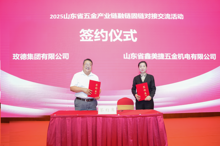 玫德集團(tuán)有限公司山東銷售公司總經(jīng)理馬萬軍與山東省鑫美捷五金機(jī)電有限公司總經(jīng)理金曉榮簽署《深化合作框架協(xié)議》