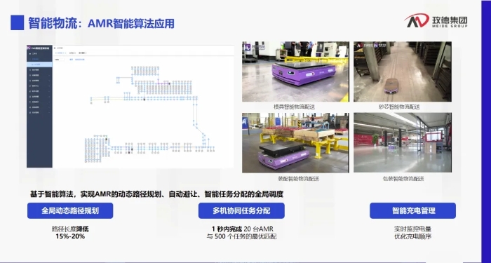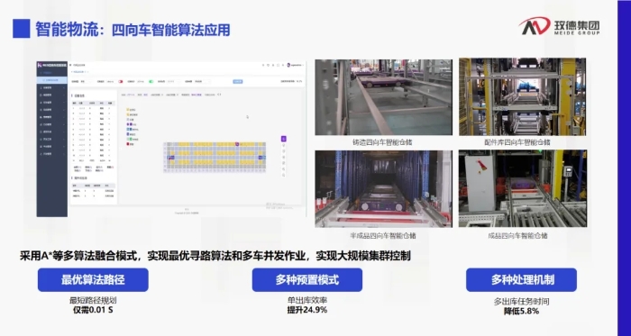 談到玫德集團在智能領域的探索,孔主席著重展示了智能化、數字化在降本增效方面的巨大優勢,從AI+鑄造的創新及應用場景,到智能物流的四向車智能算法應用,再到智能物流AMR智能算法應用,孔主席向與會專家呈現出智能算法、大規模集群控制等技術為鑄造企業帶來的新可能、新提升。